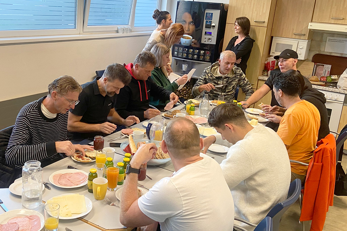 Wir starteten unseren Betriebsausflug gemütlich bei einem gemeinsamen Frühstück in der Firma. Der Tisch war reichlich gedeckt mit allem was das Herz begehrt – von süß bis sauer, mit frischem Brot und Gebäck, Fruchtsäften und natürlich Kaffee. Hervorzuheben ist hier die Kochkunst unserer Maria, die ihre leckeren selbstgemachten Marmeladen mitbrachte. Herzlichen Dank dafür! Im Anschluss ging es mit einem Bus von Hammertinger Reisen nach Lambrechten.