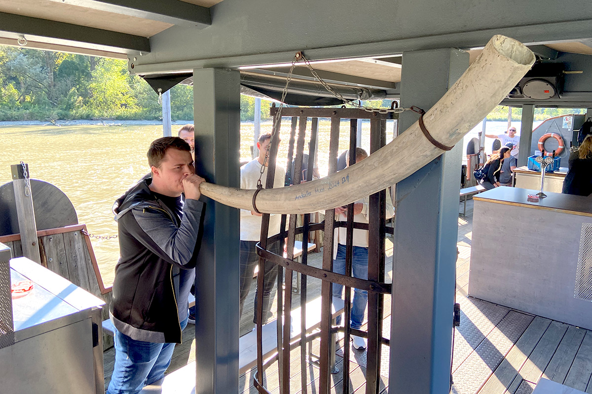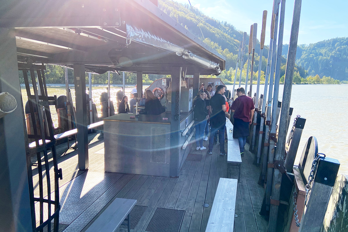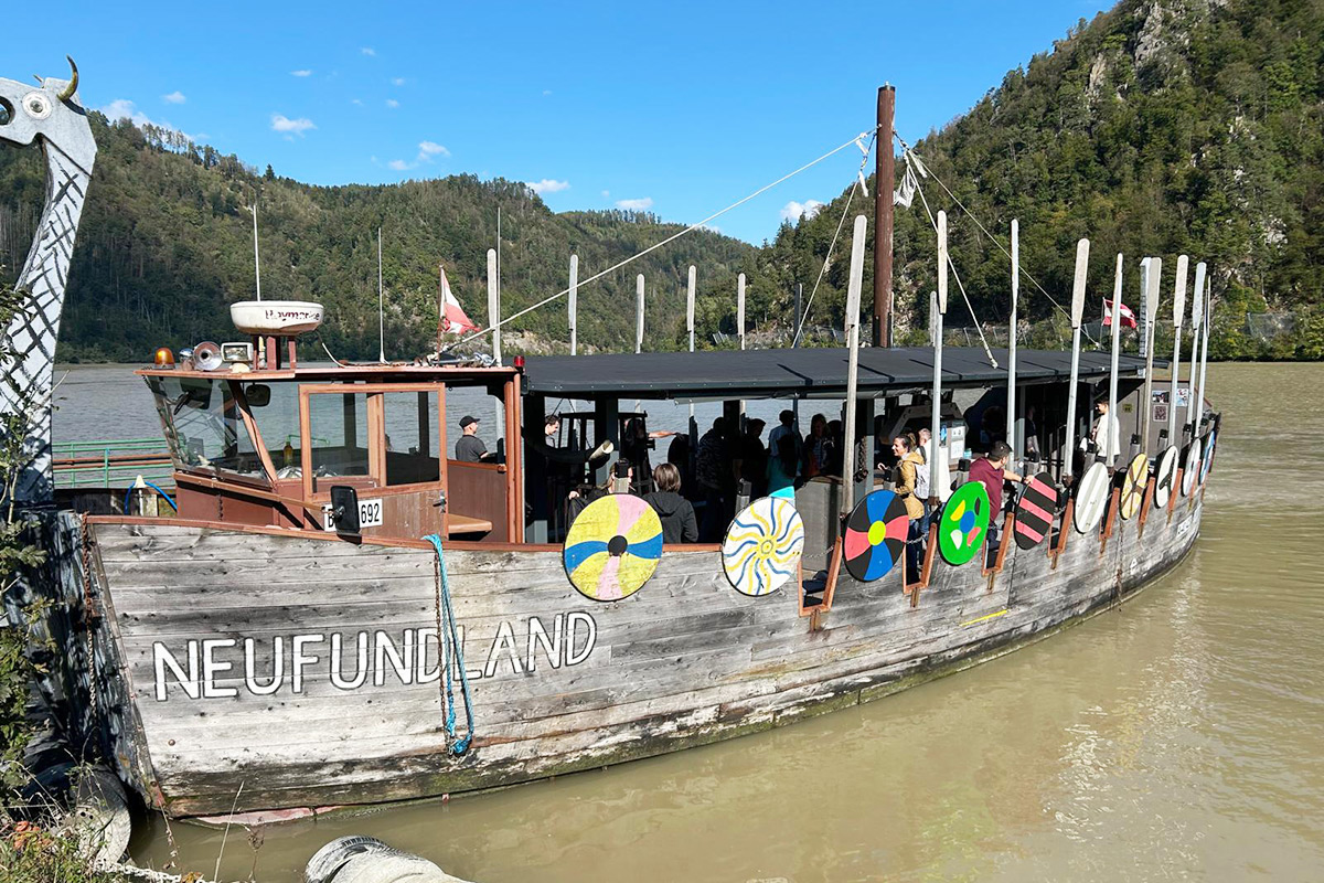 Der Höhepunkt des Tages war zweifelsohne die Wikinger Schifffahrt auf der Donau. Der Kapitän des Schiffes „Neufundland“ erwartete uns an der Anlegestelle in Exlau: „O‘zapft is und los geht´s!“, war das Ablegekommando.